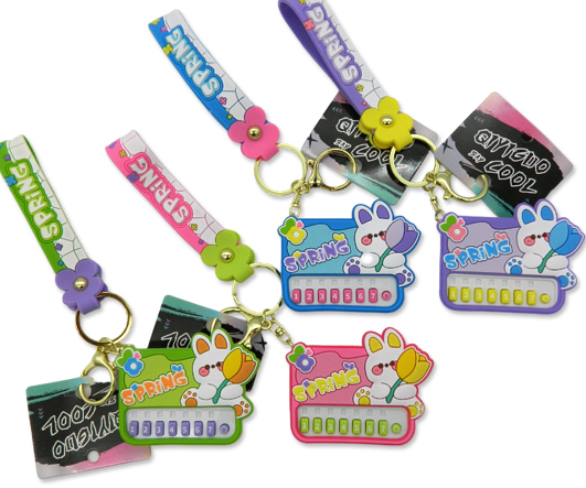 Брелок для ключей DE-266 "Весенний зайчик" пластик и резина, 8х6см, музыкальный, с карабином, кольцом и петлей, цвета ассорти (1/12/300)