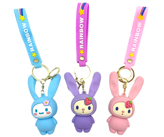 Брелок для ключей DH-171 "Зайчик с клубничкой" резиновый 7см, мягкий, с карабином и кольцом, ассорти (1/50/300)