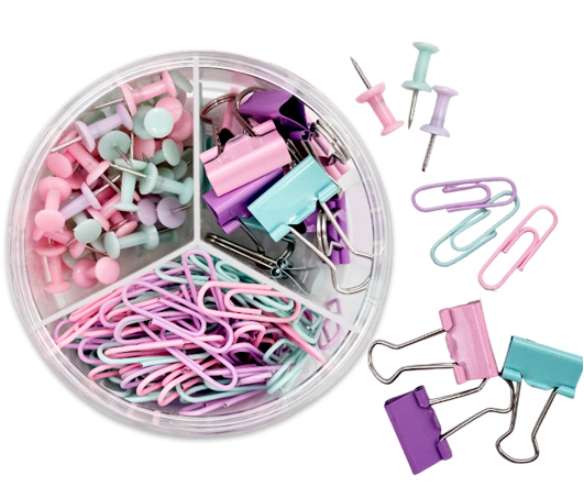 Набор канцелярских мелочей DO-502 "Пастельные" 162 пред (скрепки, кнопки, зажимы) в пластиковом боксе DL2284 (1/24/144)