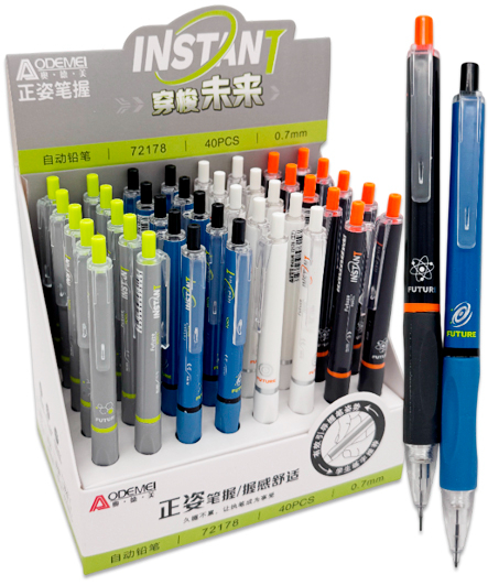 Механический карандаш с матовым пластиковым корпусом в нежных пастельных оттенках с рисунком, с резиновым грипом. Подача грифеля осуществляется с помощью кнопочного механизма.