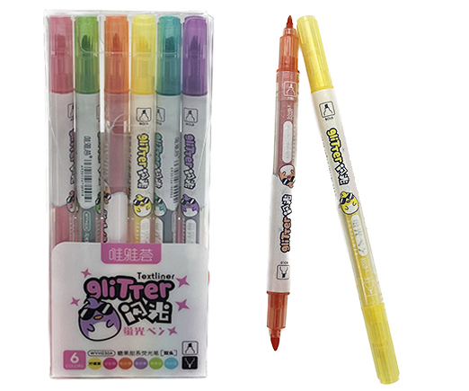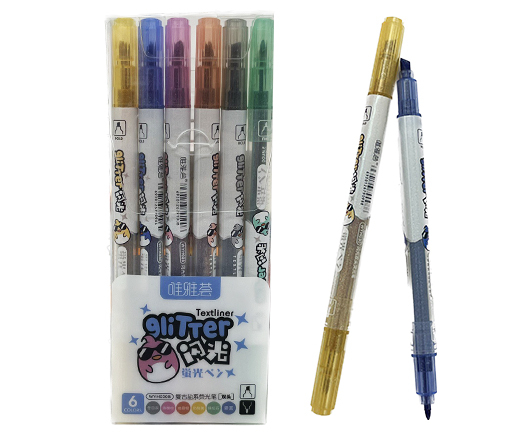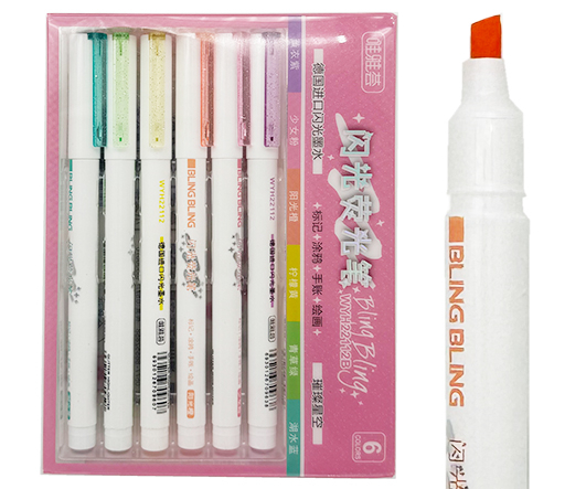 Маркер выделитель 6 цв. DE-198 "Глиттер" яркие тона, 1-4мм, скошенный, круглый корпус, уп ПВХ WYH22112B (1/12/144)