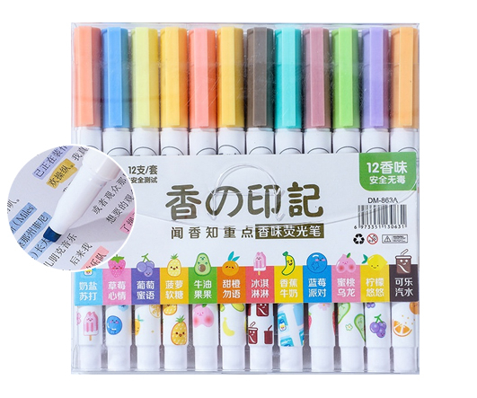 Маркер выделитель 12 цв. DC-353 Ароматизированные, 1-4мм, скошенный, круглый белый корпус, в уп ПВХ DM-863A (1/20/120)