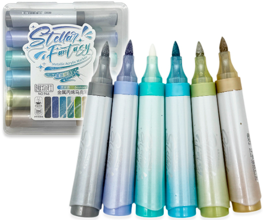 Маркер акриловый 6 цв. DI-481 "Металлик" 1-4мм, кисть, круглый корпус, в пластиковом пенал №946 (2/14/112)