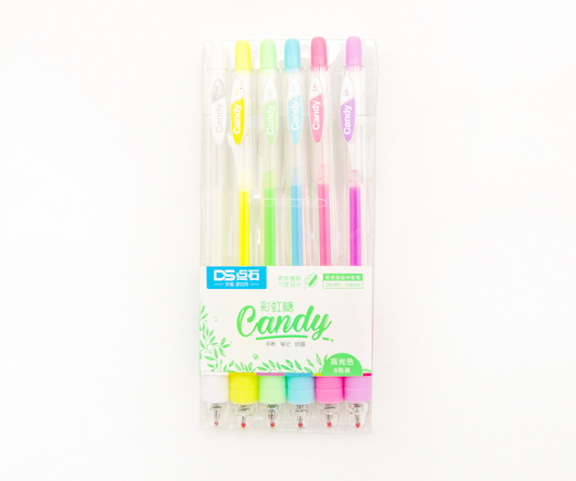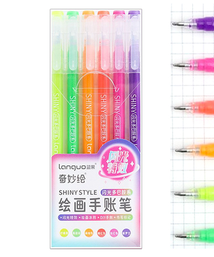 Ручки гелевые набор- 6 цв. DE-69 "Неоновые" с глиттером 1,0мм, прозрачный круглый корпус, уп ПВХ LG-D0237 (1/72/288)