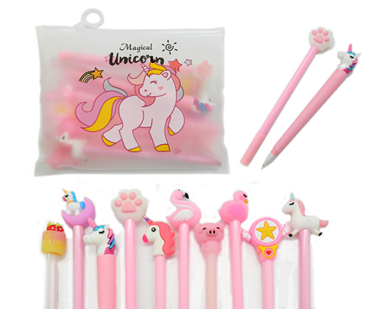 Ручки гелевые набор-10 шт. WGLJ-7 "Единорог" (черн) 0.5мм, игольчатый стержень, розовый корпус с фигуркой, в зип пакете (1/1/200)