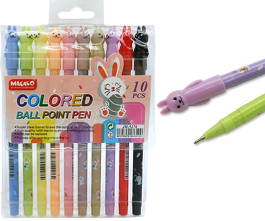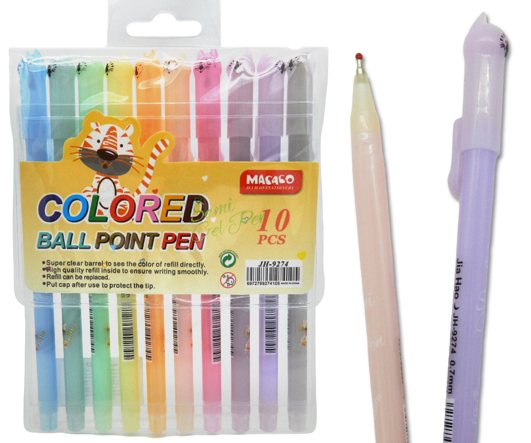 Ручки набор 10 цв. DE-447 0,7мм, цветной круглый корпус, фигурный колпачок, в уп ПВХ на липучке, JH-9274-10 (1/24/288)