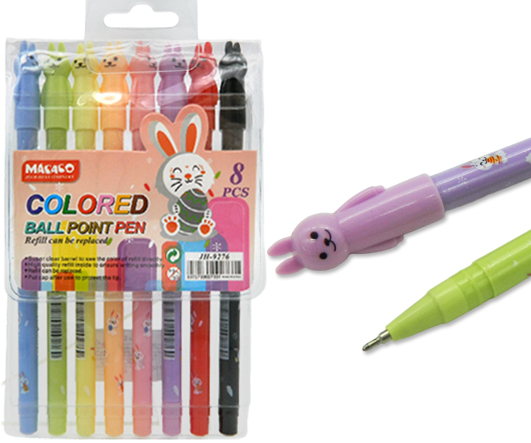 Ручки набор 8 цв. DE-445 0,7мм, цветной круглый корпус, фигурный колпачок, в уп ПВХ на липучке, JH-9276-8 (1/20/360)