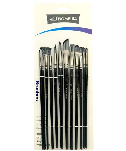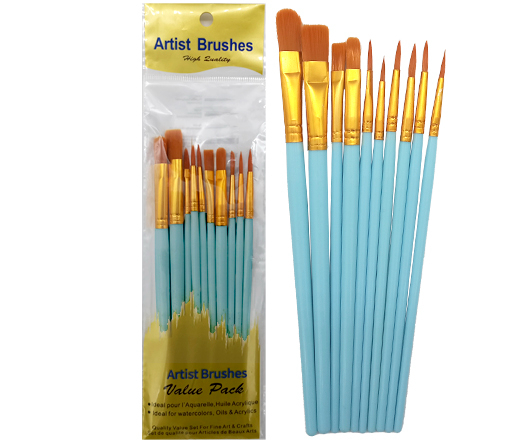 Кисти набор 12 шт. Синтетика DH-124 Круглые (№ 1, 1, 2/0, 2, 2, 3) плоские (№ 6, 5/8) овальные (№ 5, 8) веерная (№ 4) скошенная (№ 6) (1/480)