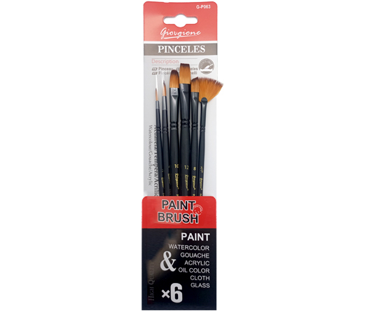 Кисти набор 6 шт. Синтетика DD-102 Круглые (№2,4) плоские (№8,10,12) веерная №3/0, черная ручка, в ПВХ пакете G-P063 (1/12/144)