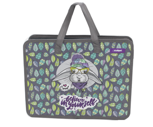 Папка для творчества А4 с ткан. ручками CQ-7609 "Зая в шапочке" пластиковая, молния сверху, серая с рисунком (1/240)