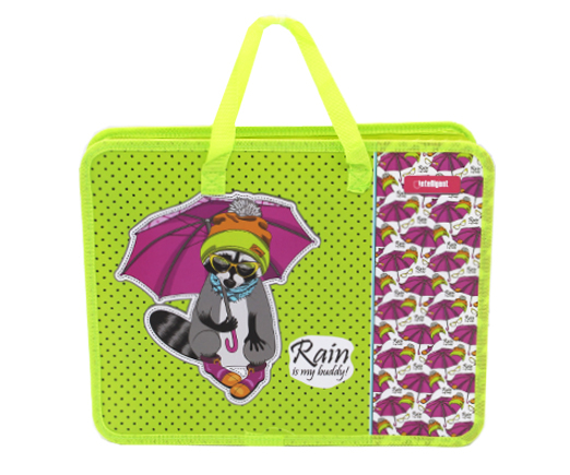 Папка для творчества А4 с ткан. ручками CQ-7611 "Енот под зонтиком" пластиковая, молния сверху, салатовая с рисунком (1/240)