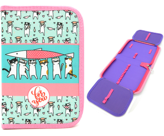 Пенал 1 отд. CM-35812 "Котики и рыбка" с 2-мя створками, текстиль 21*14*4см, голубо-розовый (1/100)