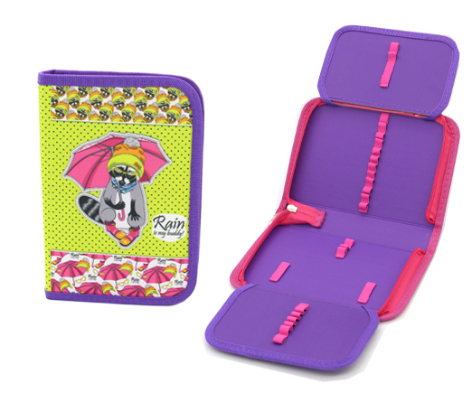 Пенал 1 отд. CP-68334 "Енот под зонтиком" с 2-мя створками, текстиль 21*14*4см, салатовый (1/100)