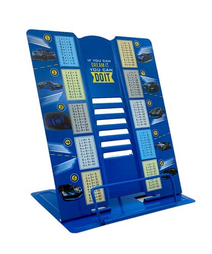 Подставка для книг DE-35963/DB-35963 INTELLIGENT "Машины" металлическая 26х21см, синяя, с таблицей умножения, в ПВХ-пакете (1/12/48)
