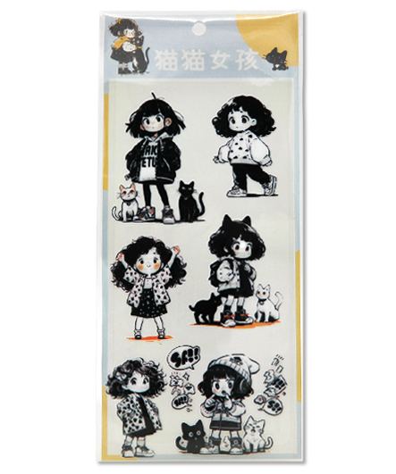 Наклейки DE-491 "Девочка и кошки" ПЭТ, 88х170мм, 8шт на листе, черно-белый цвет (1/100/200)