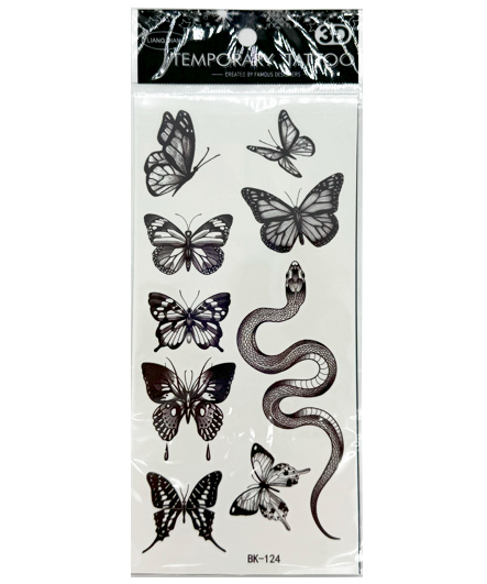 Наклейки Тату DF-230 "Змея, бабочки" 9 штук на листе, 19х9см, черно-белые BK-124 (10/500)