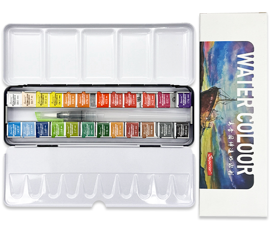 Краска акварель 24 цв. DL-332/DJ-382 SUPERIOR кюветы, в металлическом пенале, кисть с резервуаром для воды, в к/кор F963-16 (1/8/48)