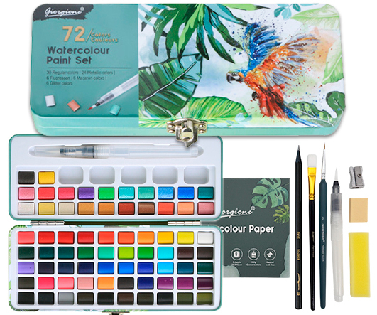 | Состав набора: | краски, карандаш, кисти, ластик, палитра, точилка, губка, бумага |