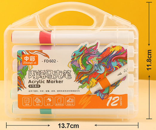 Маркер акриловый 12 цв. CZ-189 1-3мм, пулевидный, трехгранный белый корпус, в пластиковом чемодане №FD602 (1/144)