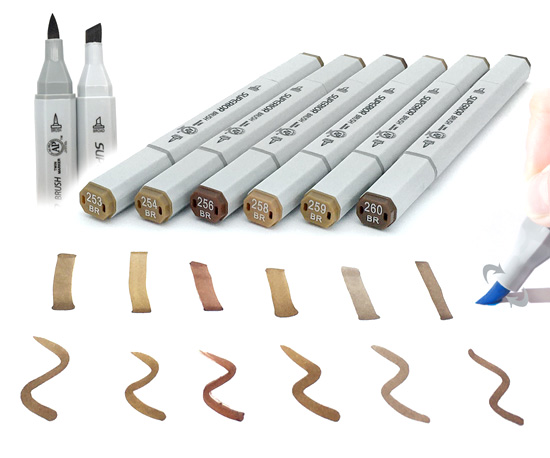 Скетч-маркеры BRUSH СС-4/9 Superior Коричневые (№247BR,248BR,249BR,250BR,251BR,252BR) кисть+скош 6мм (6/6/48)