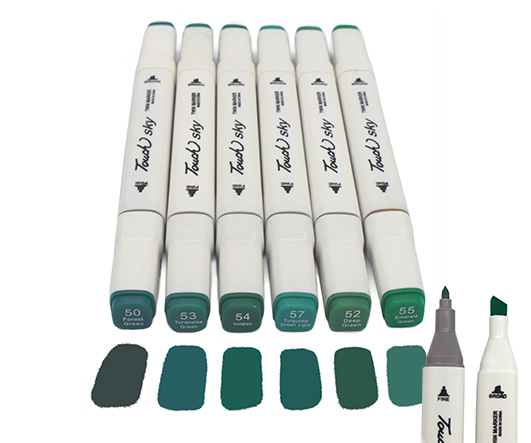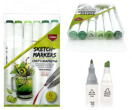 Скетч-маркеры 6шт. CH-1205 ЗЕЛЕНЫЕ (50, 52, 53, 54, 55, 57) Квадратный 2х ст (острый+скош) белый корпус (1/1772)