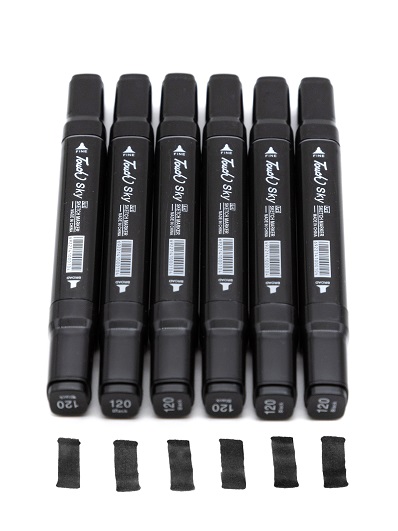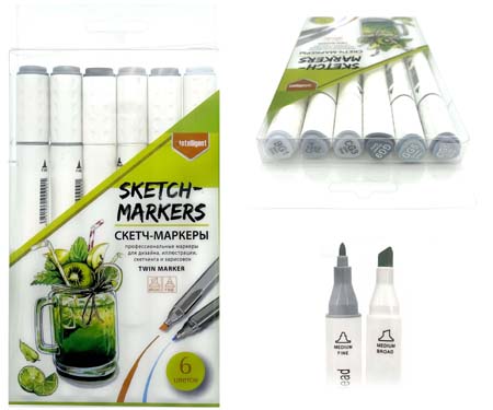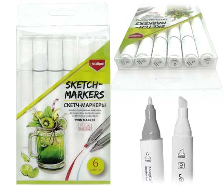 Скетч-маркеры 6шт. CH-1208 СЕРЫЕ (WG3, WG4, WG5, WG6, CG4, GG5) Квадратный 2х ст (острый+скош) белый корпус (1/1772)