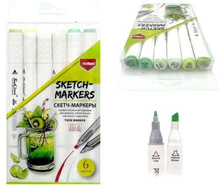 Скетч-маркеры 6шт. WST-10/24 СВЕТЛО-МЯТНЫЕ Четырехгранный 2х ст (острый+скош) белый корпус, в упаковке ПВХ №6801 (1/1/510)