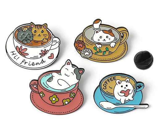Значки DC-389/DB-103 "Котик в чашке" 4 ШТУКИ металл, цвета ассорти, на подложке, в ПВХ- пакете (1/400)