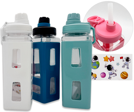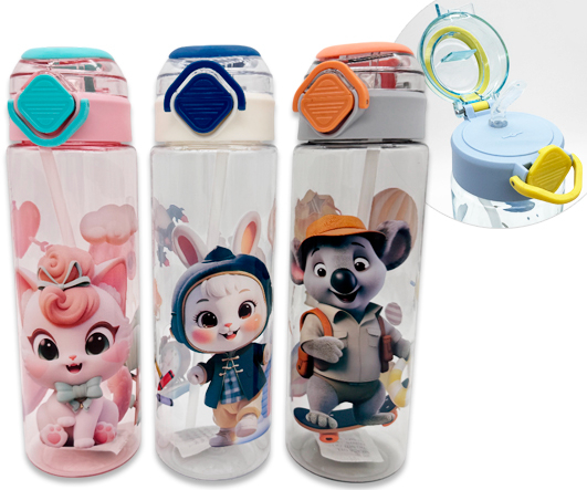 Бутылка для воды DN-198 750мл, 23х7х7см, пластик, пластиковая ручка, с насадками для питья и наклейками, ассорти (1/60)