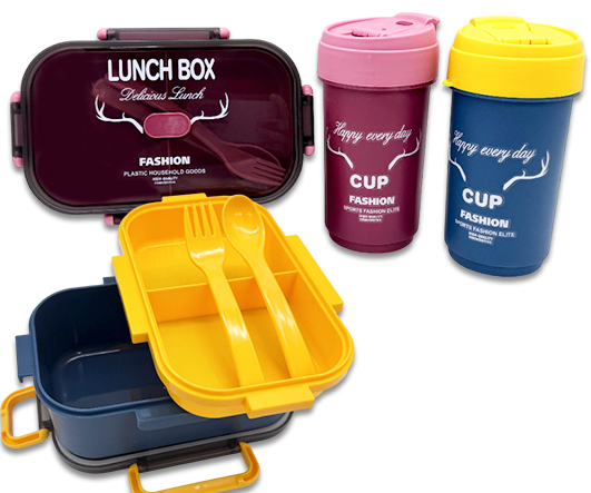 Контейнер DN-216 "Ланч бокс с бутылкой" с крышкой, 2отделения, 3 секции, ложка и вилка, пластик, 900мл (1/48)