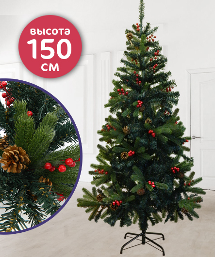 Новогодняя Елка 1,50м. DL-385/DG-385 Напольная, комбинированные ветки (ПВХ+сосна), с ягодками и шишками, в к/к (1)
