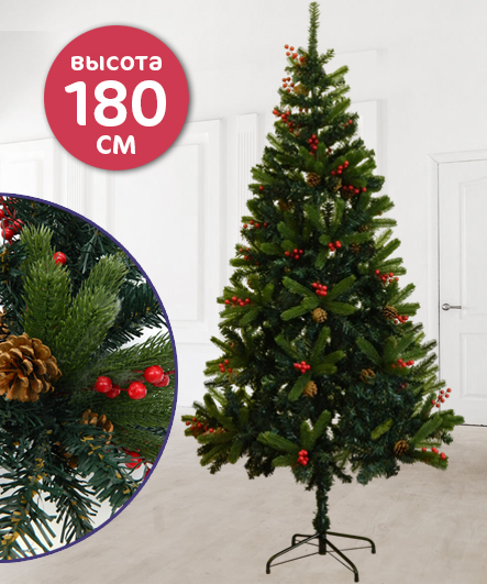 Новогодняя Елка 1,80м. DL-386/DG-386 Напольная, комбинированные ветки (ПВХ+сосна), с ягодками и шишками, к/к (1)