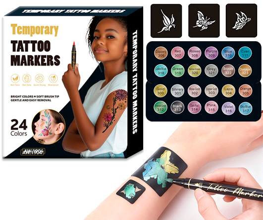 Маркер для аквагрима 24 цв. DO-209/DP-216 "Металлик" 1-5мм, кисть, круглый черный корпус, с трафаретами, в к/кор AW.1904 (1/8/48)